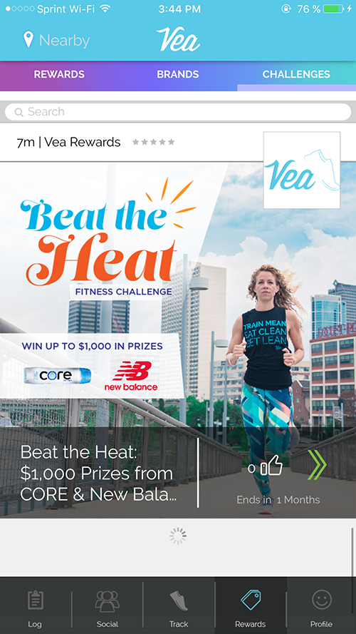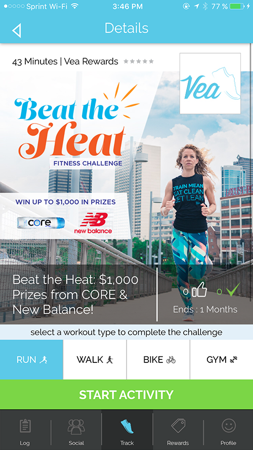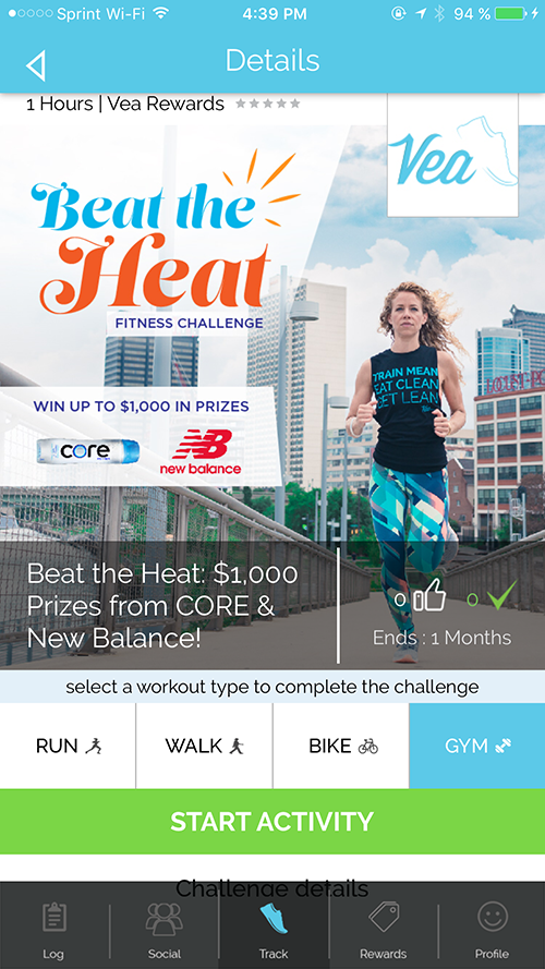 - Open Vea Fitness App -> Rewards (in main navigation) -> Challenges (top right) -> Tap “Beat the Heat” -> Start Activity (whichever workout type you prefer - walk, run, bike or Gym Check In)